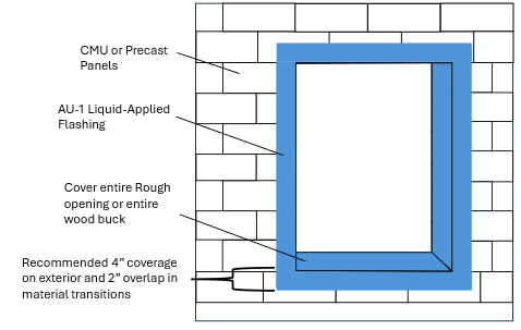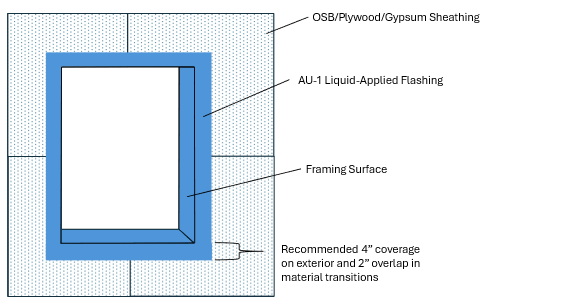 Apply AU-1 LAB as directed in the previous page around all rough openings as a liquid-applied flashing. Allow the product to become tack-free before applying AU-1 LAB across entire exterior surface.